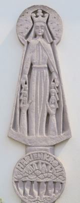 Die erste Maiandacht feiern wir vor dem Kurhauseingang vor der Schutzmantelmadonna. Diese zeigt die 6 Gründungsschwestern von Marienkron, die sich, wie alle, die im Zisterzienserorden leben und wirken, unter ihren besonderen Schutz gestellt haben.