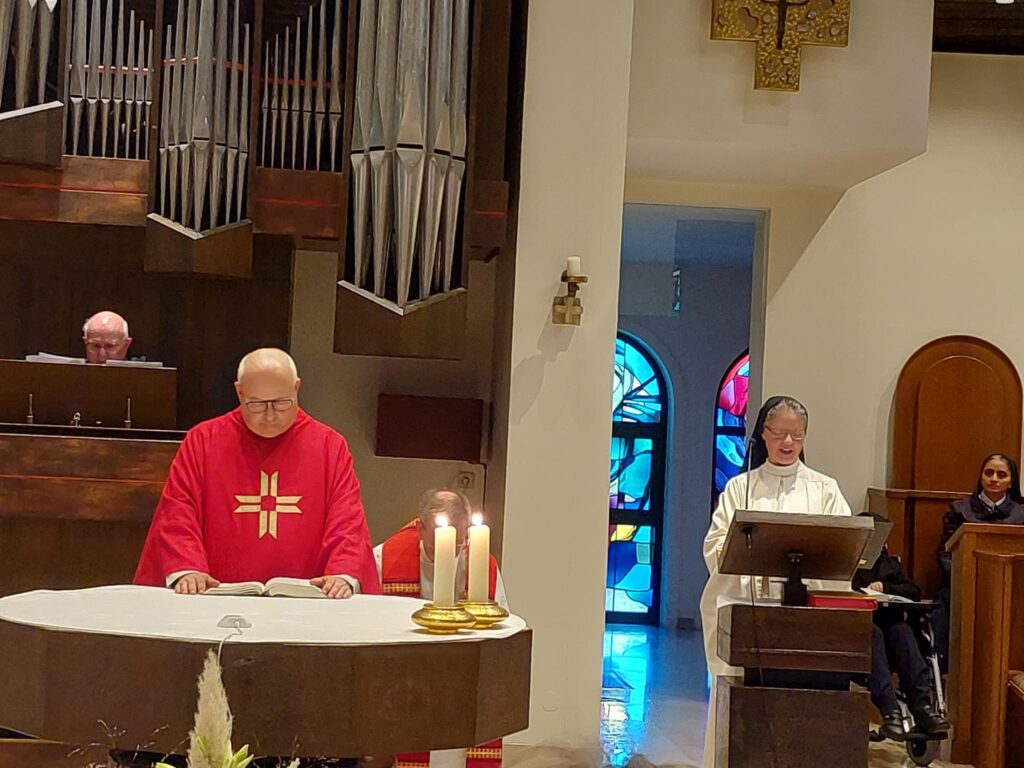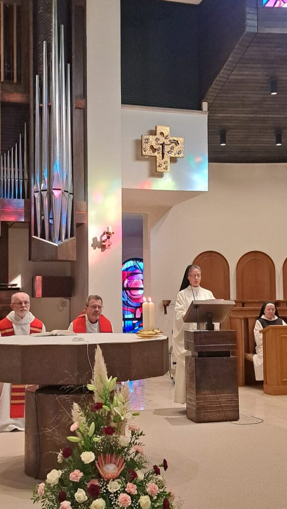 Zu unserem zweiten Klosterfest am 18. Oktober anlässlich des 70-jährigen Jubiläums von Marienkron kamen über 100 Gäste und so weit zu hören war, sind alle sehr zufrieden wieder nach Hause gegangen. Da Herr Abt Maximilian aus gesundheitlichen Gründen verhindert war, hatte er den Hauptökonom des Stiftes Heiligenkreuz, P. Markus, delegiert, der jedoch den größten Teil der Kulinarik übernommen hatte. So war P. Meinrad Hauptzelebrant. Dieser hat zu Beginn Auszüge aus der Pfarrchronik von 1955 vorgelesen. Die Festpredigt zum Thema „Grenzen überwinden“ hielt sein Mitbruder P. Josef. Er meinte, die Marienkroner Schwestern seien darin sehr gut gewesen. Den Eisernen Vorhang gibt es nicht mehr, doch es gäbe immer wieder Grenzen zu überwinden: zwischenmenschlich, persönlich, länderübergreifend usw.