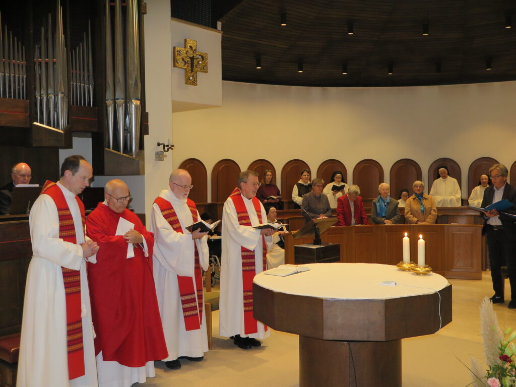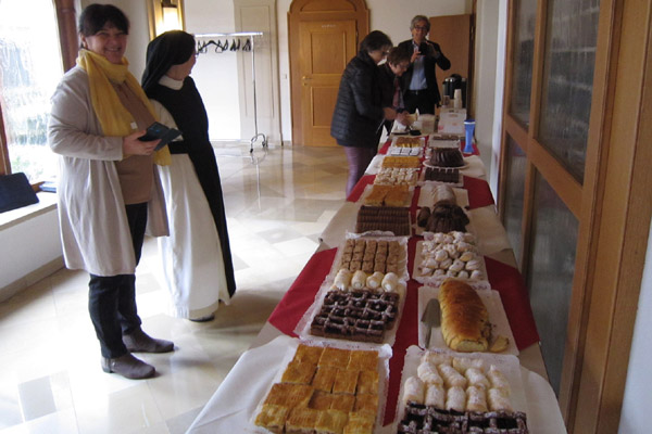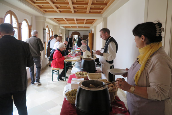 Anschließend gab es die Premiere unseres Films „Ora et labora et lege“. Wer wollte, konnte im Anschluss im Kreuzgang die Agape mit der bewährten Maronicremesuppe von P. Markus, Sacherwürstel, Gebäck, Bier und Wein genießen. Ehemalige Mitarbeiterinnen hatten ein großartiges Kuchenbuffet neben dem Kaffeekessel aufgebaut. Die Tische waren voll besetzt. Es war ein Fest der Begegnungen, des Kennenlernens und des Austausches.